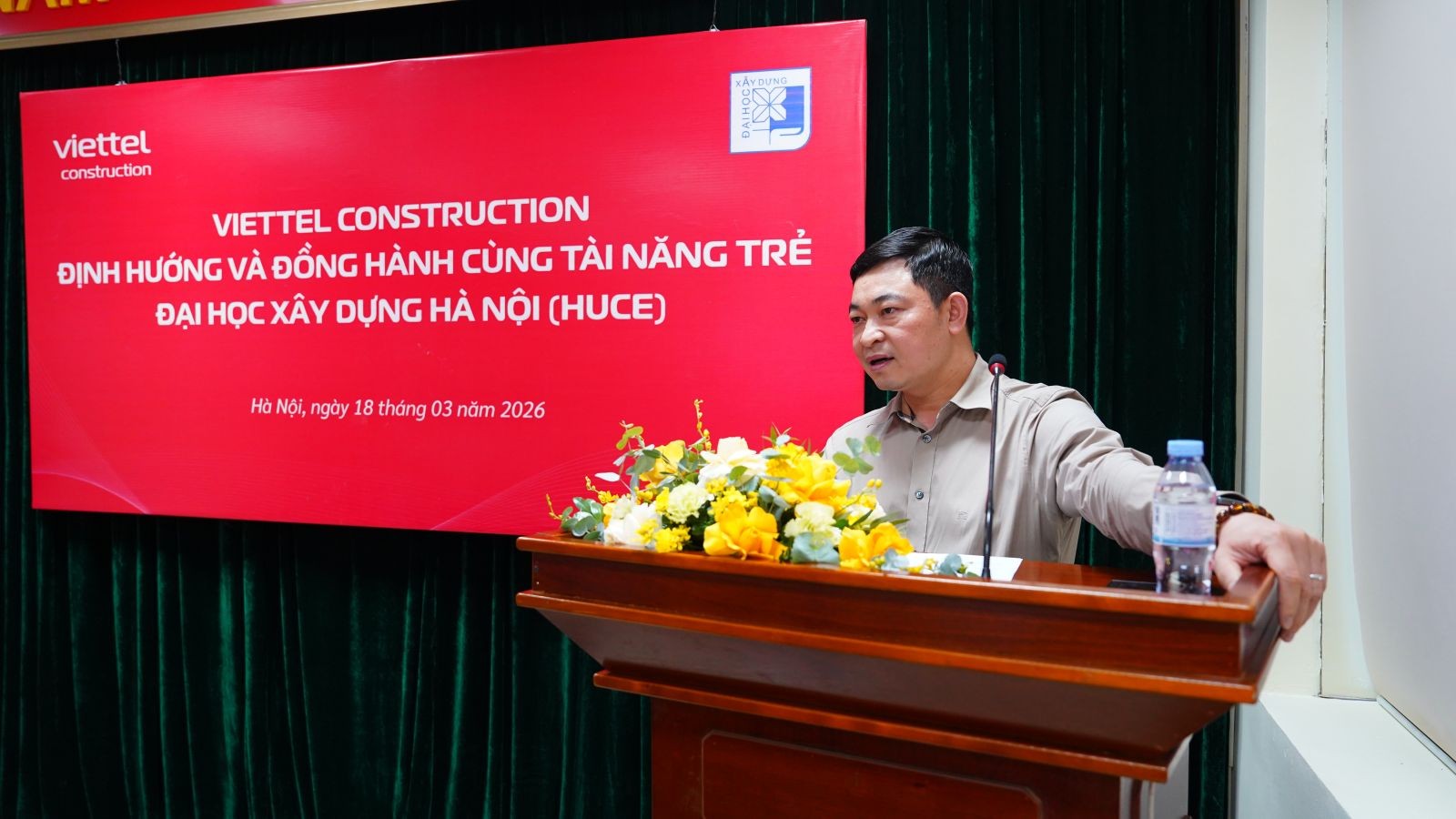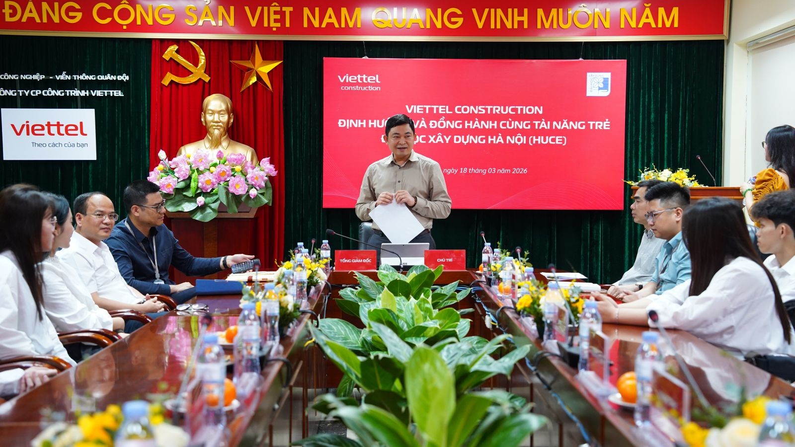 Chia sẻ với các bạn sinh viên, PTGĐ Đặng Văn Chung đã giới thiệu tổng quan về VCC, mô hình hoạt động, các lĩnh vực kinh doanh trọng điểm cũng như định hướng phát triển trong giai đoạn tới. Trong đó, lĩnh vực xây dựng được xác định là một trong những trụ cột tăng trưởng quan trọng của Tổng Công ty, với dư địa phát triển lớn ở cả mảng B2B, B2C, hạ tầng, giao thông, nhà ở xã hội và các dự án quốc tế. Từ thực tế đó, lãnh đạo VCC khẳng định sinh viên các nhóm ngành xây dựng, kiến trúc, giao thông, vật liệu, cơ điện hay kinh tế xây dựng đều có nhiều cơ hội nghề nghiệp tại VCC trong thời gian tới.